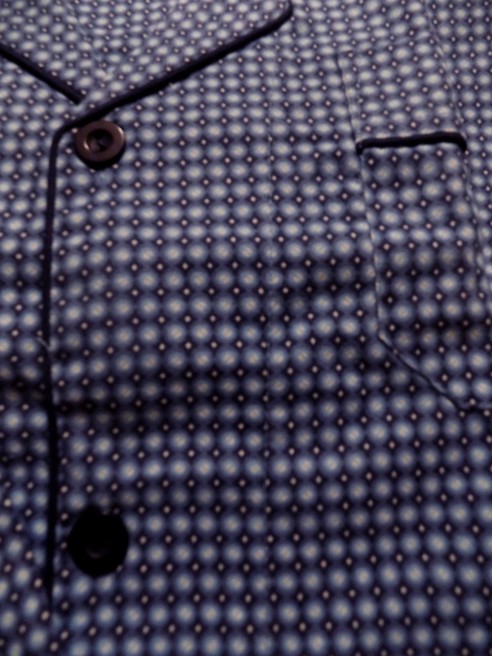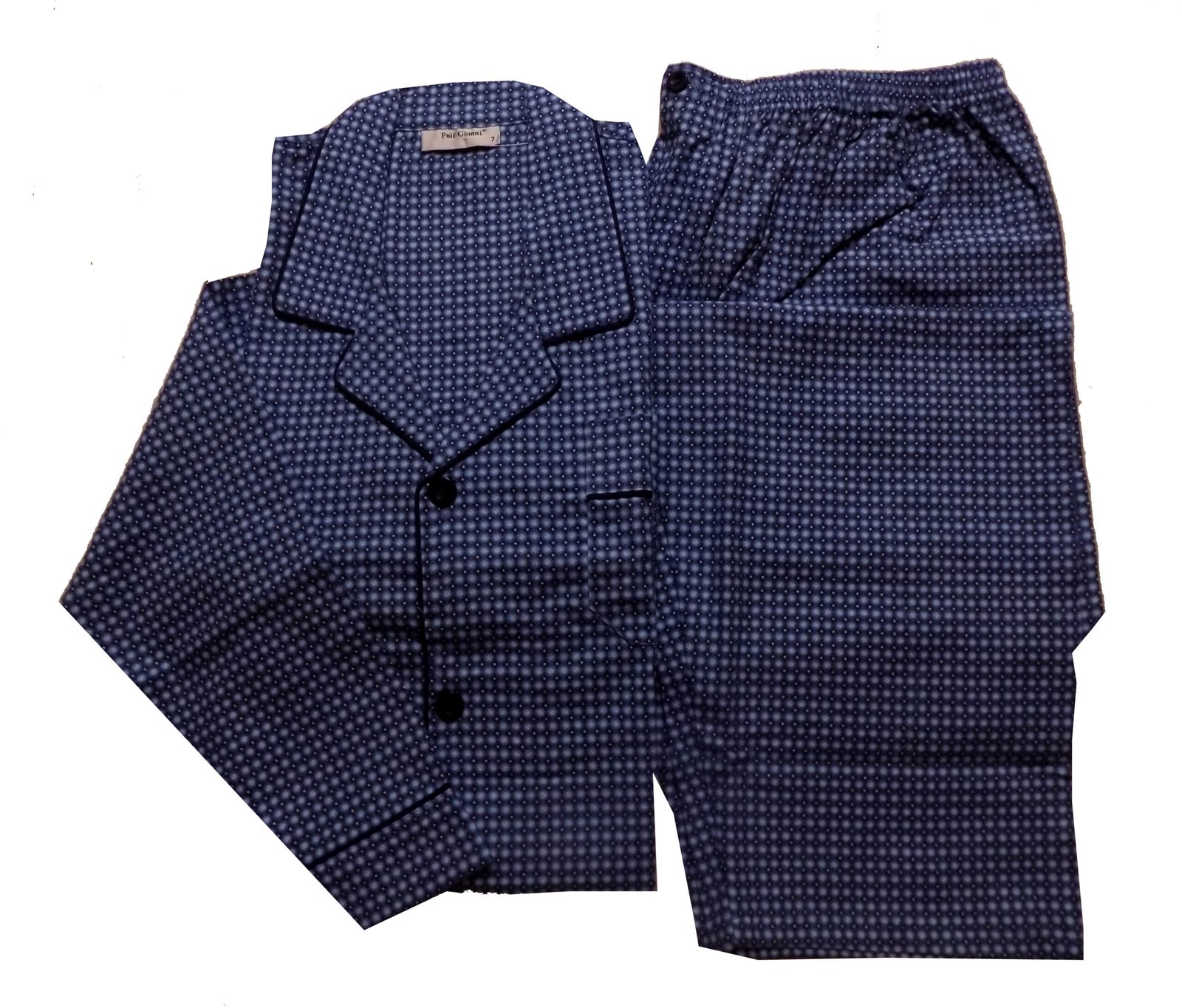 Πυζάμα κλασική, με κουμπιά, τσεπάκι στο στήθος και δύο μπροστινές τσέπες.